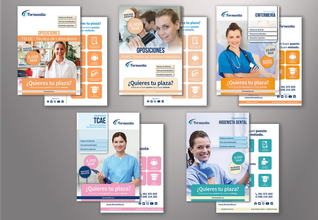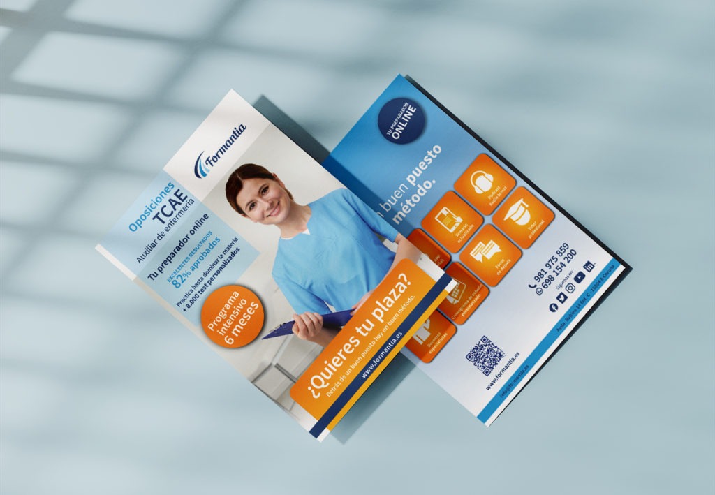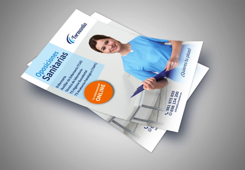 Formantia es una academia online que prepara oposiciones sanitarias. Para atraer alumnos y realizar la comunicación de las nuevas convocatorias de exámenes se realizan flyers que se envían a los distintos centros de formación sanitaria así como hospitales y centros de salud.