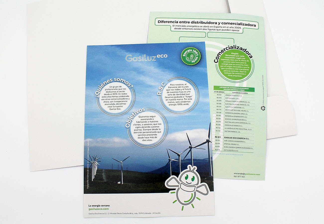 GasiluzEco es una comercializadora de electricidad que actúa en Galicia y Asturias. Aporta el nombre para el que creamos todo un sistema de marca que identifique a la empresa. Su punto fuerte es la relación que establecen con sus clientes pasando a ser uno más de casa. Unimos a este punto fuerte su juventud, sencillez y transparencia en un sector como el eléctrico a veces tan complejo.